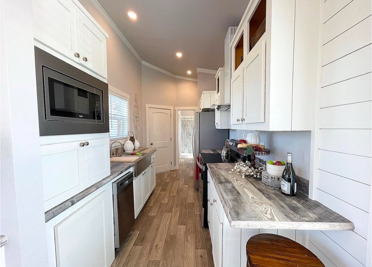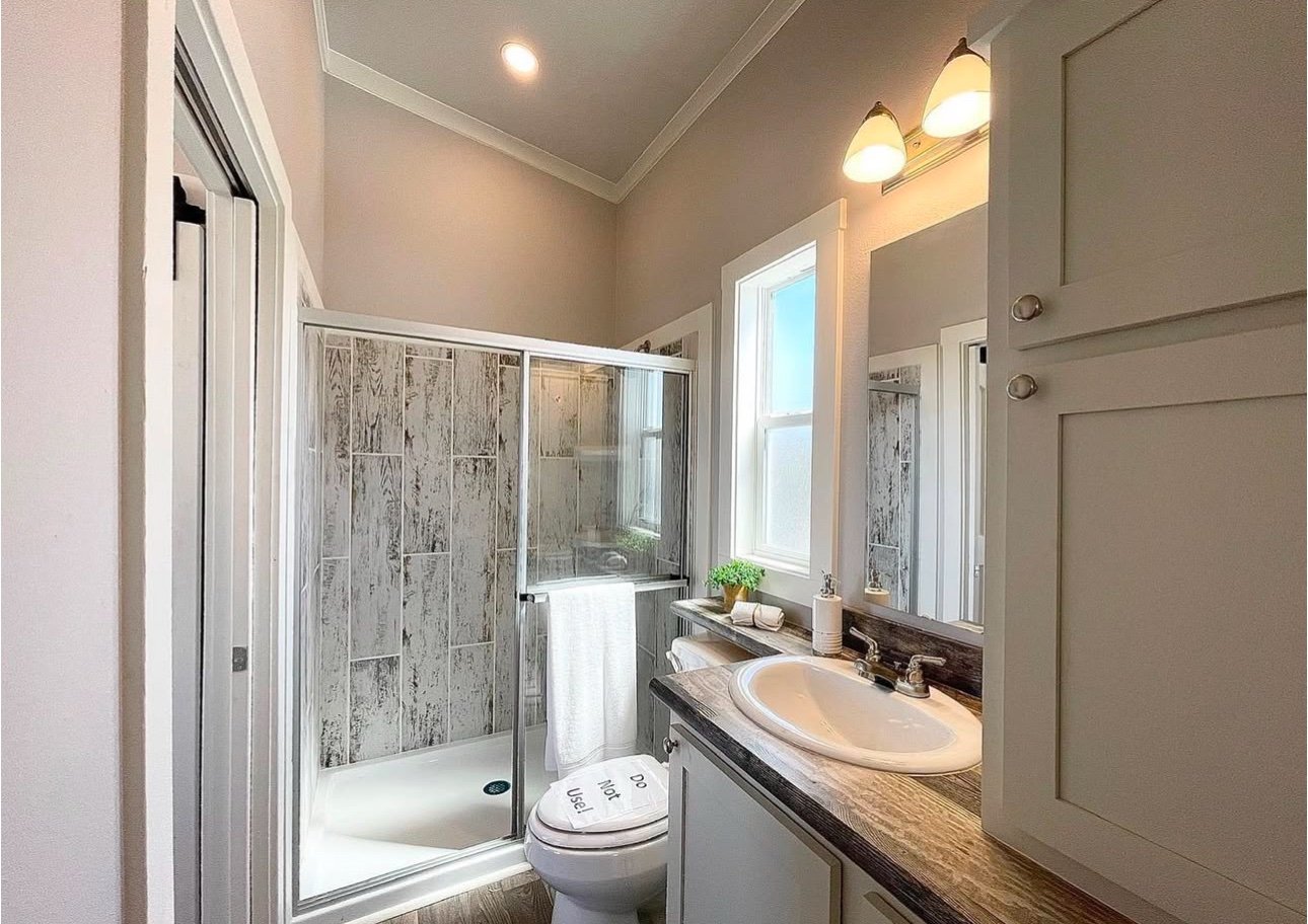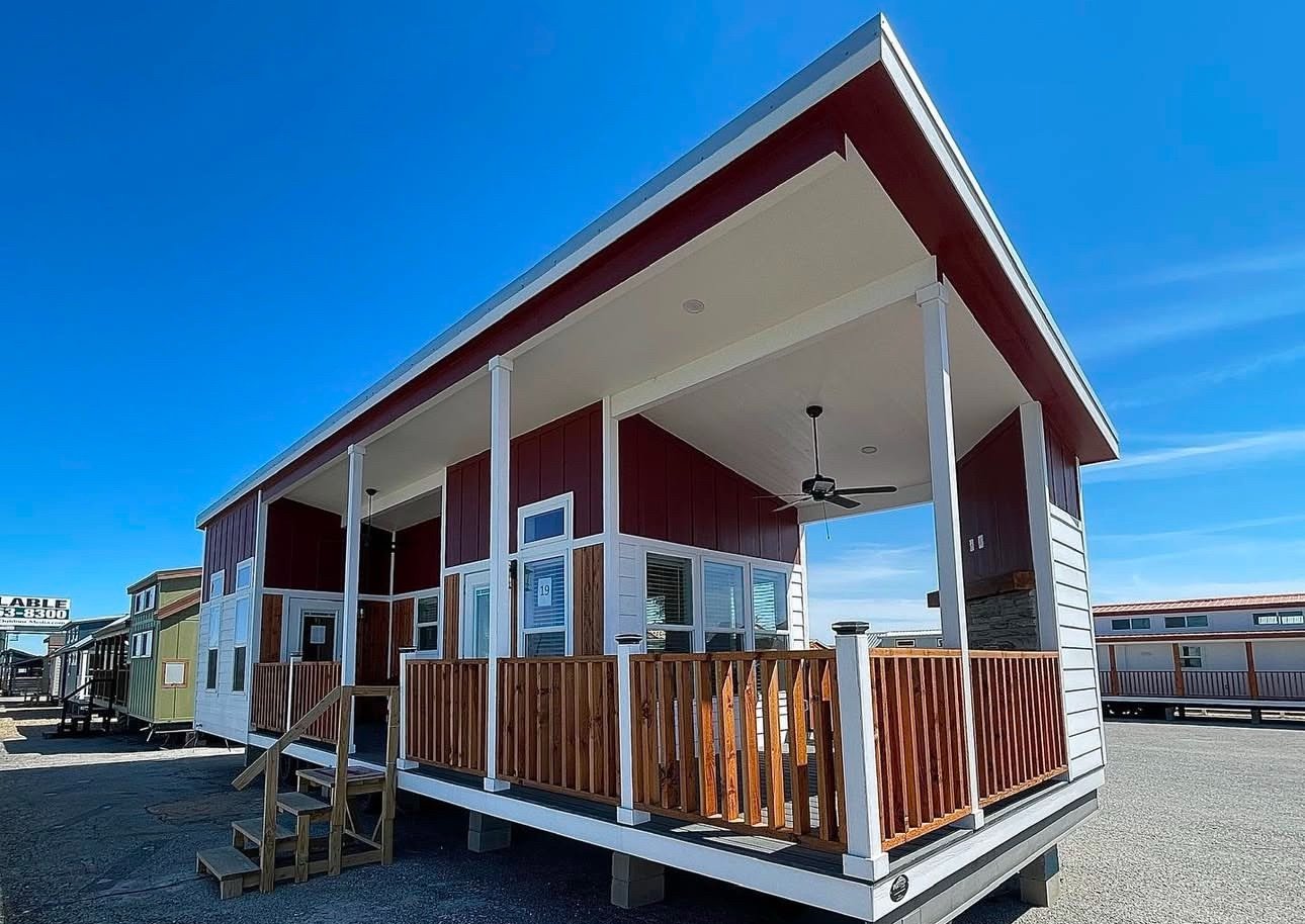 This one is packed with some amazing features! The wrap around porch has been redesigned for a larger side porch off the kitchen, and we’ve added cedar accents and a beautiful rock exterior fireplace! The interior is equally impressive with white cabinets, shiplap accent walls, tall mono-sloped ceilings, tile shower and a king sized bedroom with double barn door closets and access to the side porch!