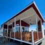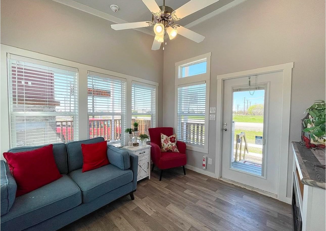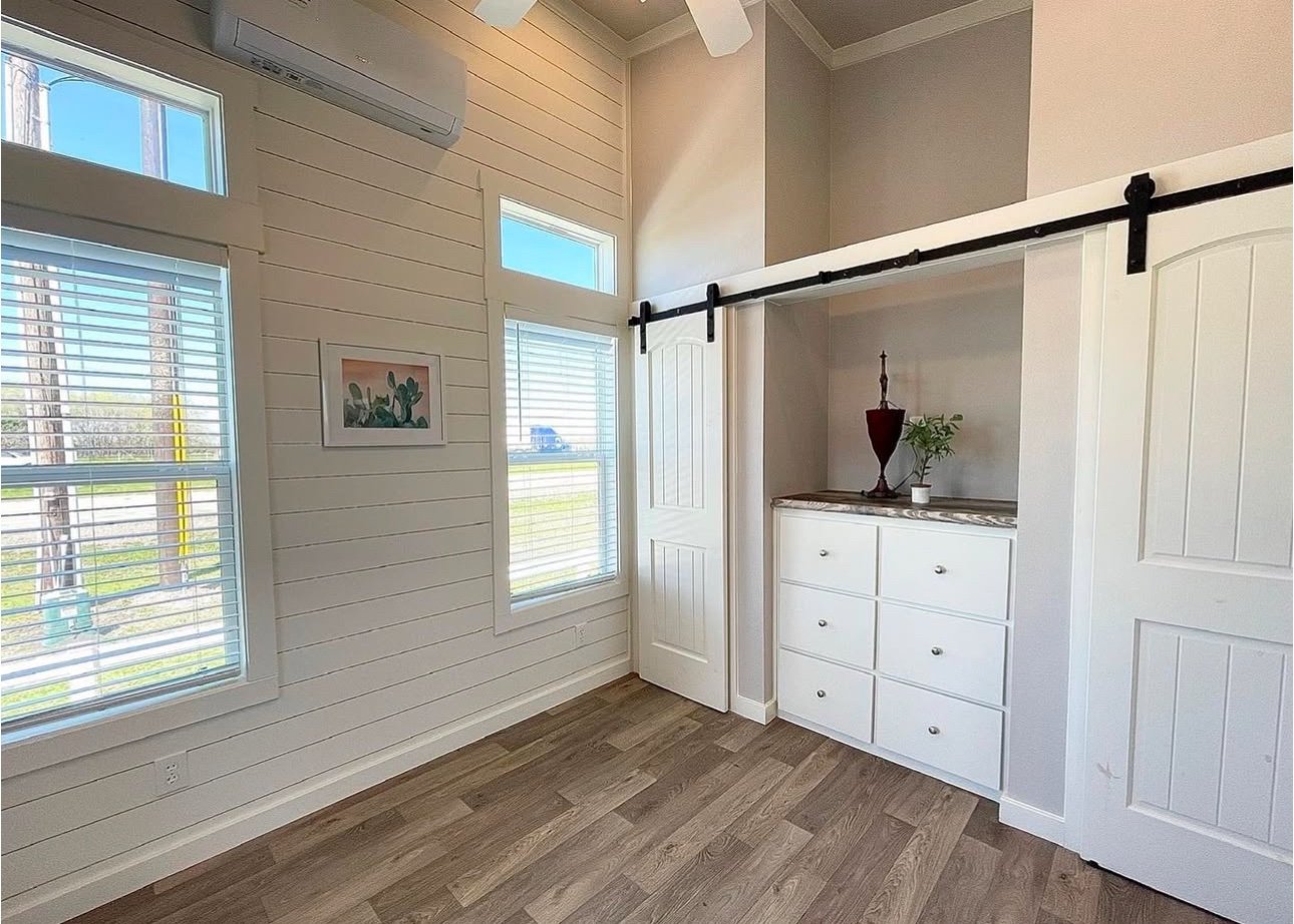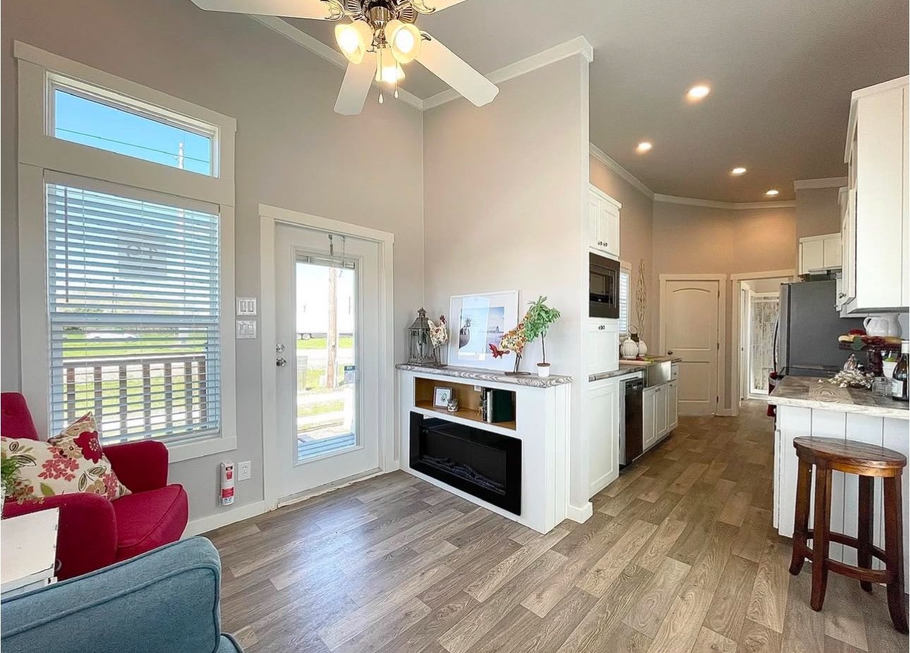 This one is packed with some amazing features! The wrap around porch has been redesigned for a larger side porch off the kitchen, and we’ve added cedar accents and a beautiful rock exterior fireplace! The interior is equally impressive with white cabinets, shiplap accent walls, tall mono-sloped ceilings, tile shower and a king sized bedroom with double barn door closets and access to the side porch!
