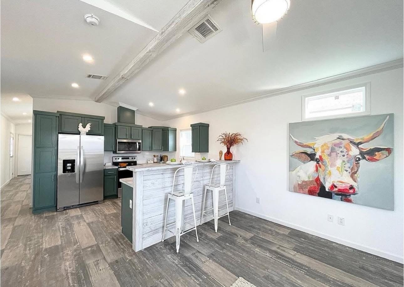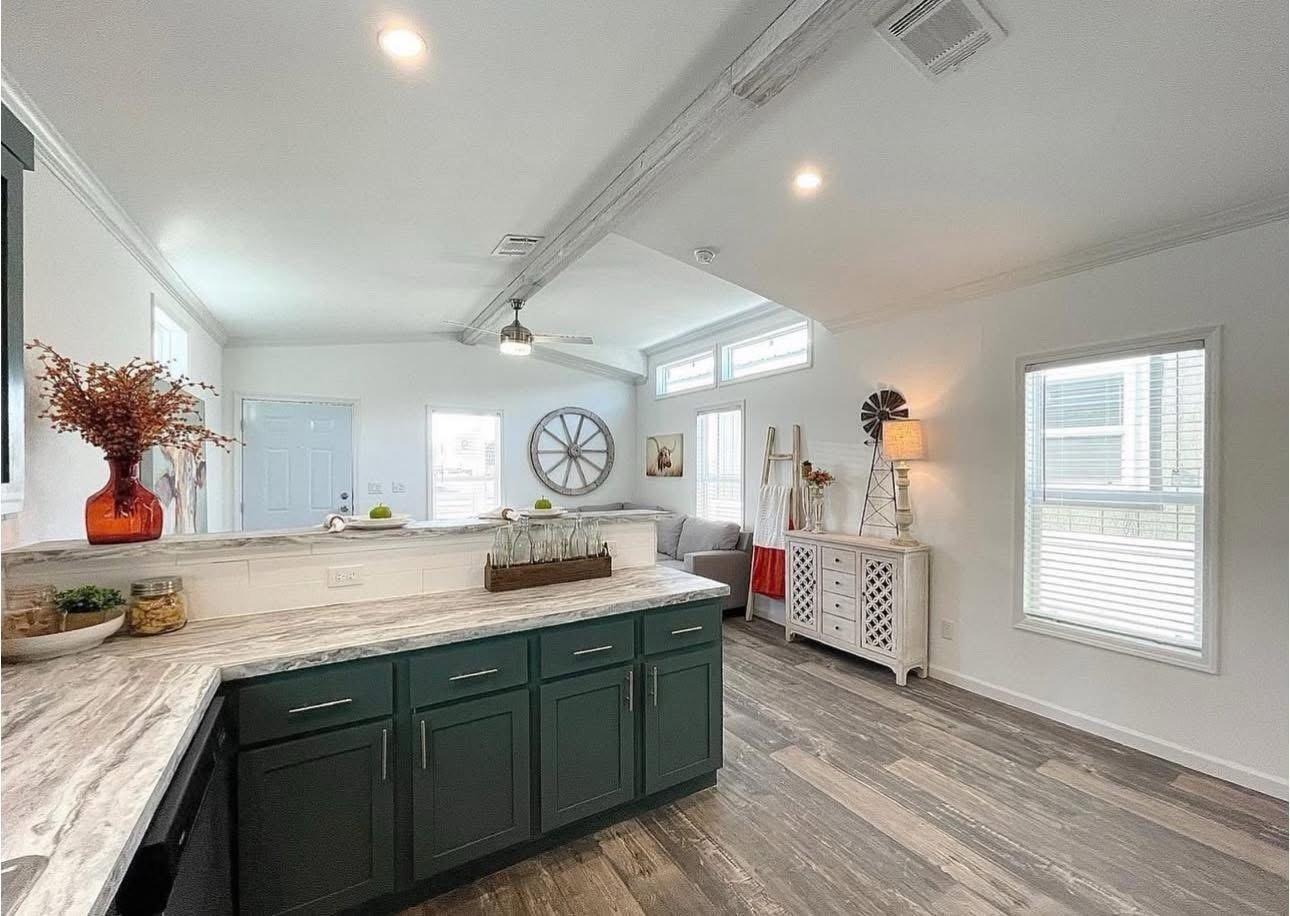 to the kitchen in a very smooth transition. For those of you that don’t like handwashing you dishes, we kept that in mind by putting a dishwasher in here for you.