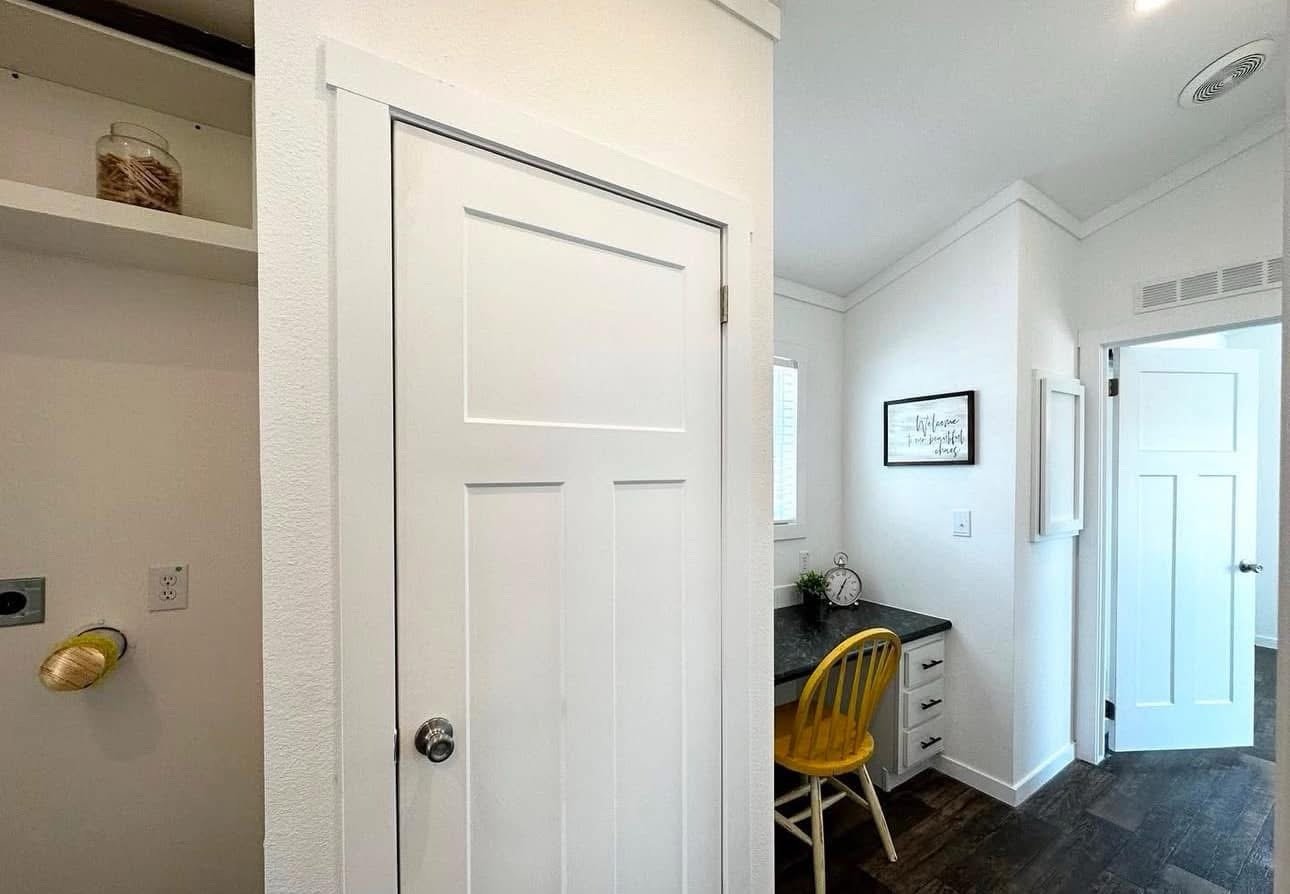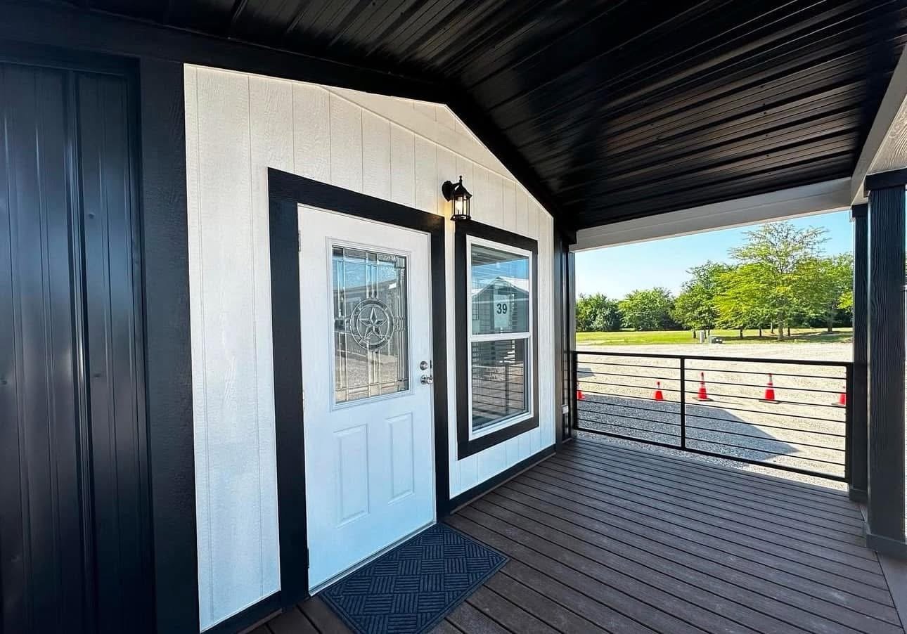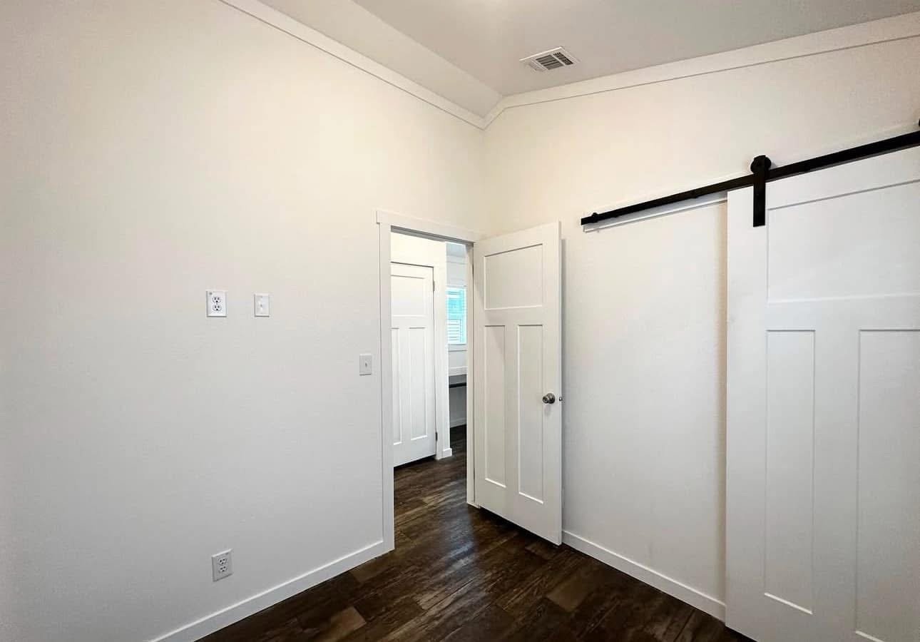 single section & You get a floating entertainment center, clerestory windows, a covered front porch, a metal roof, a gorgeous tile shower with rolling barn doors, and a desk in the hallway!