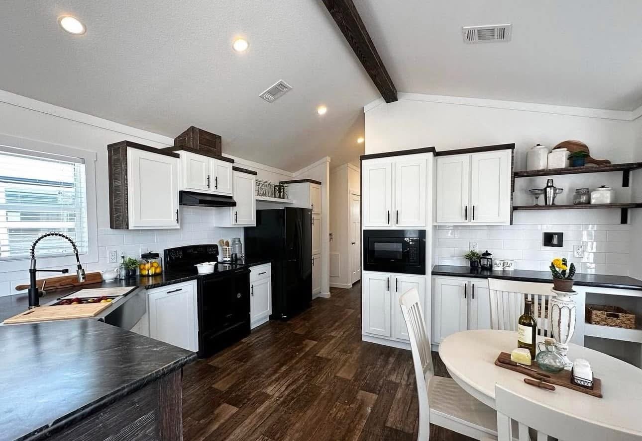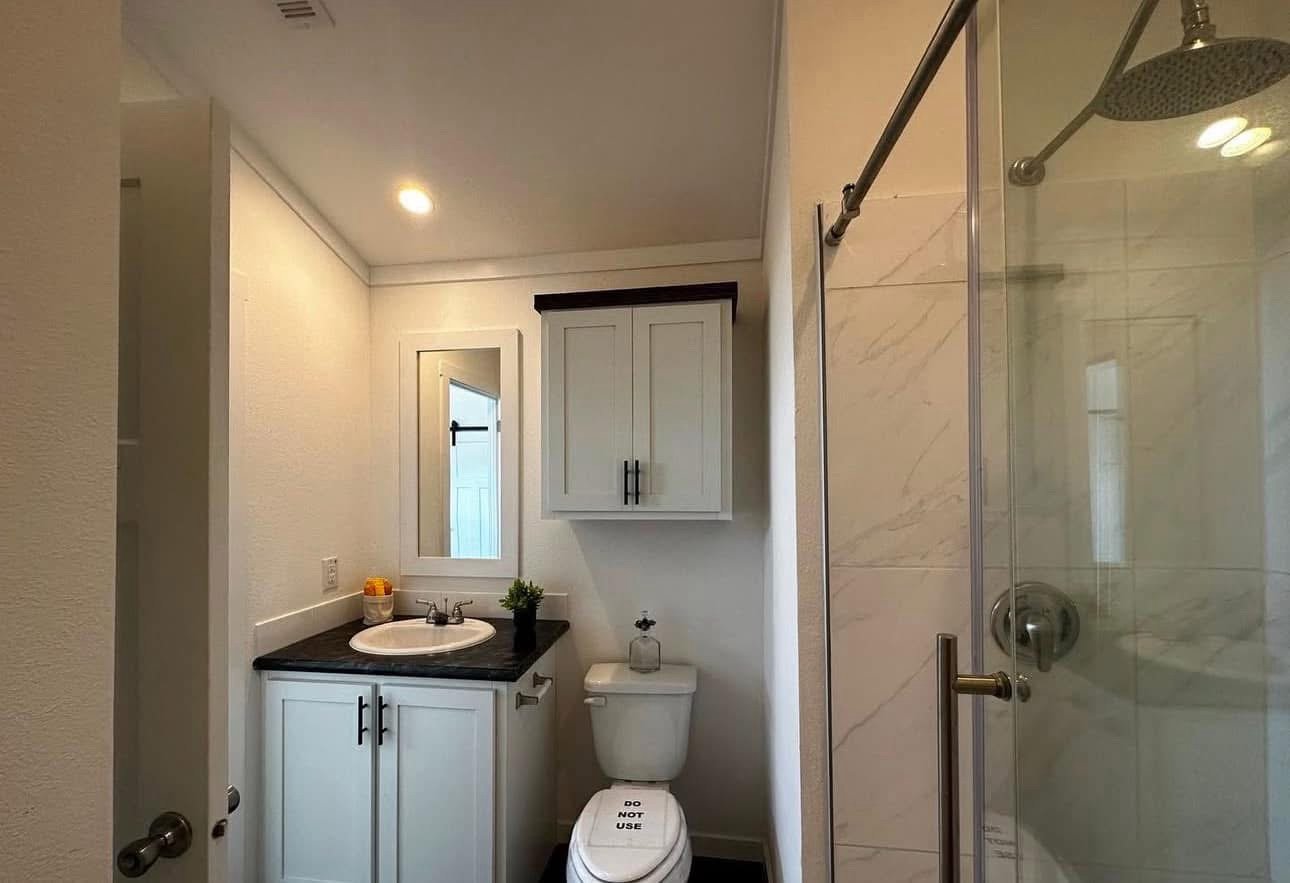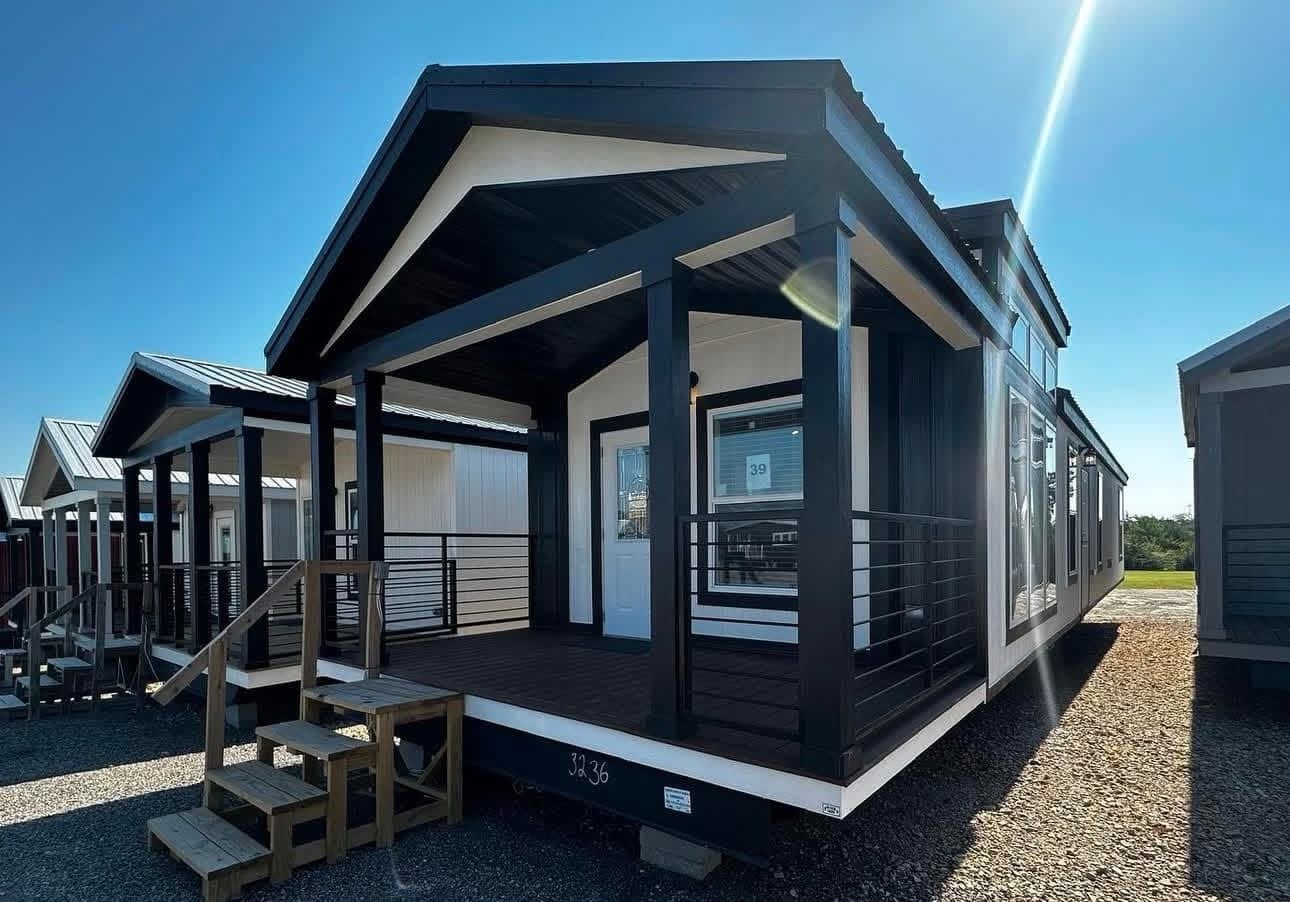 single section & You get a floating entertainment center, clerestory windows, a covered front porch, a metal roof, a gorgeous tile shower with rolling barn doors, and a desk in the hallway!