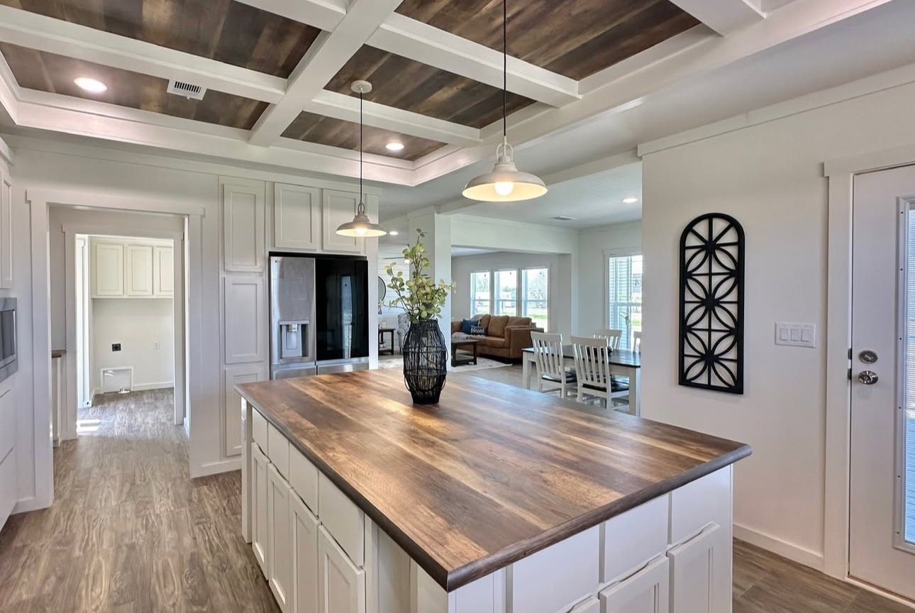 Centered above the huge island is a luxurious looking tray ceiling.
