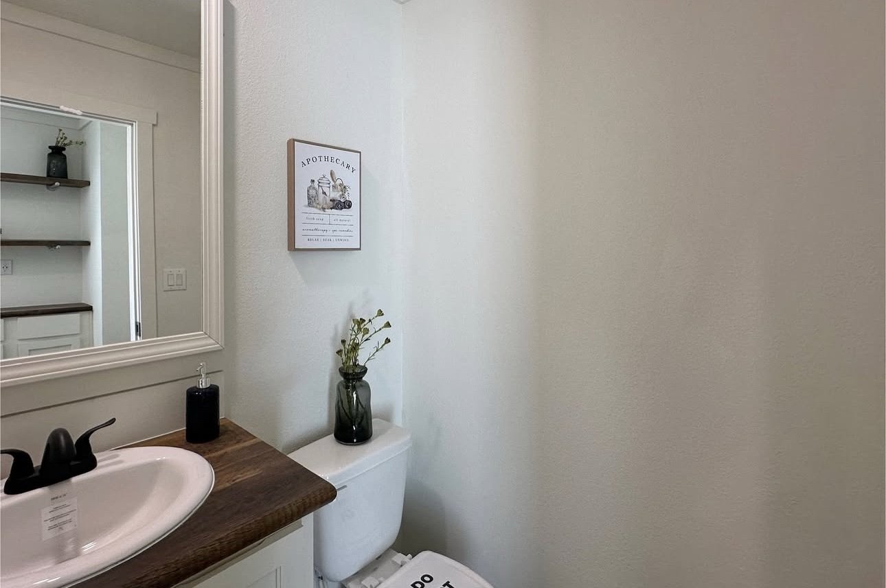 The large living room is great for furniture flexibility, accented with a shiplap wall as well as a separate accent wall that comes prepped and ready with a TV outlet that is placed on more shiplap accents with farmhouse lighting hung on each side.