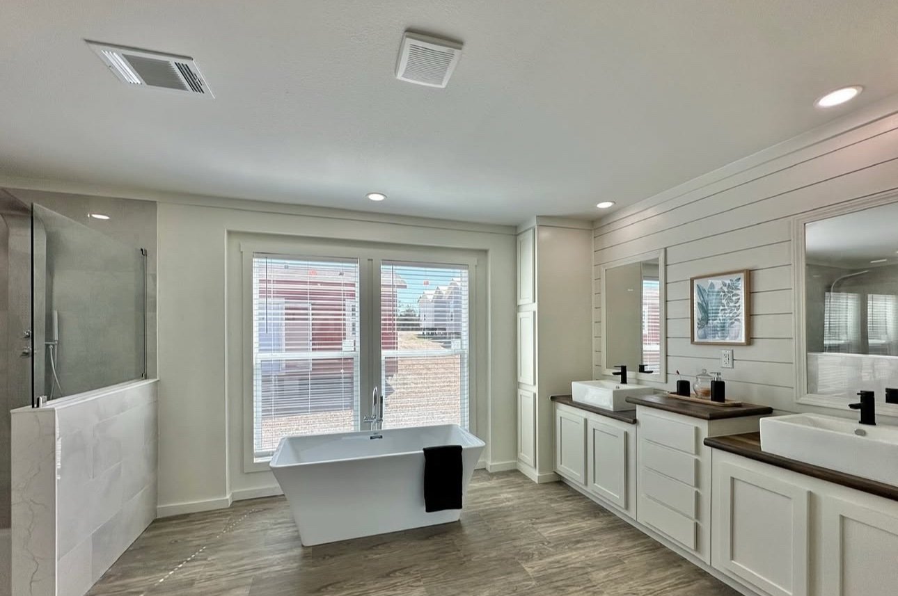 It has His & Hers sinks, a deep dish tub, a bag walk-in shower and LOTS of cabinet storage!