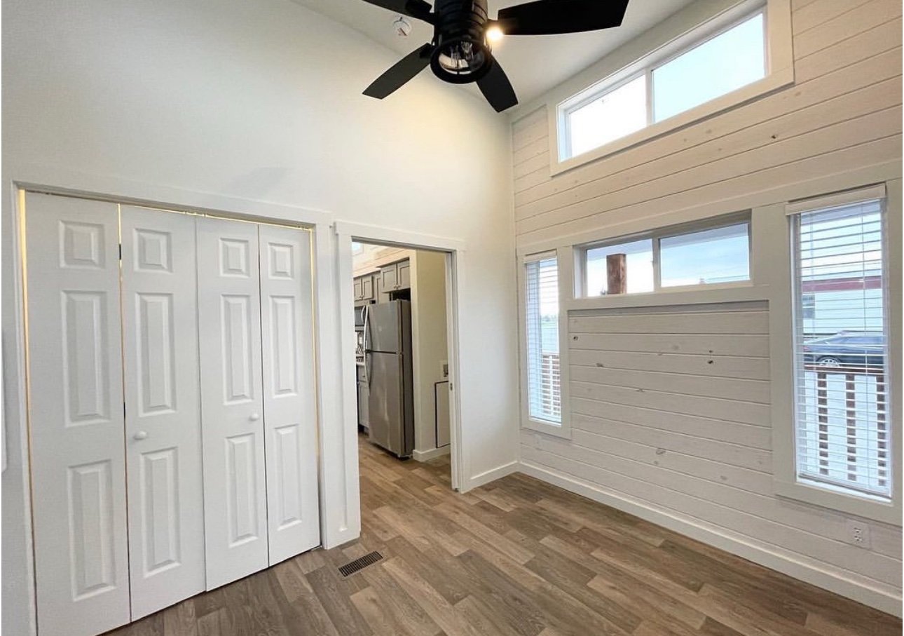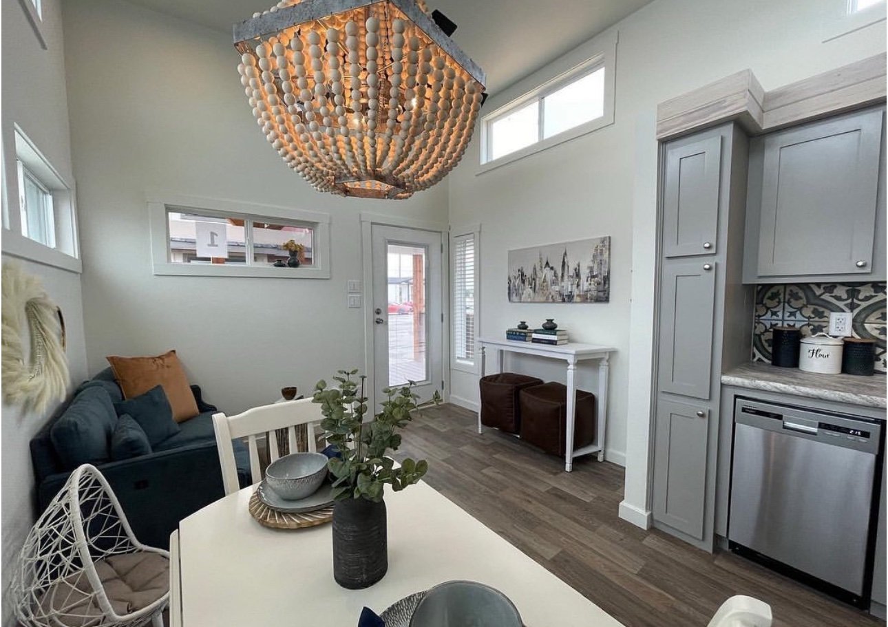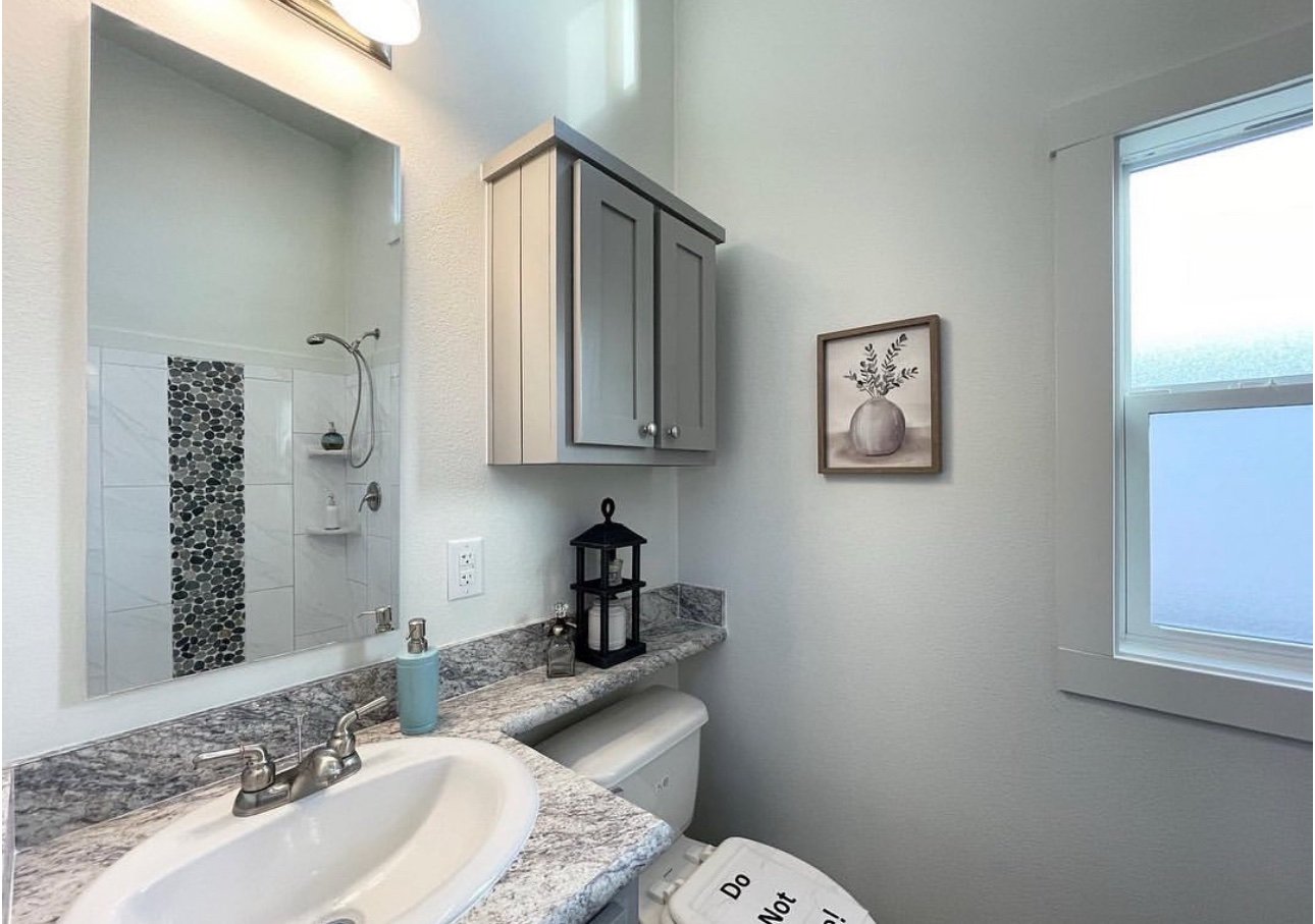 Loaded with options, this model is a one of a kind. The gorgeous cedar posts, trim, and porch railing grab your attention, and you can’t stop staring. It’s breathtaking with the copper roof. The front porch is perfectly designed to accommodate large outdoor furniture. And travel along side the side porch to a screened-in rear porch. Imagine enjoying your morning coffee on the back porch of this beauty! Inside we have custom lighting that compliments the white washed soffits over the cabinets, the new grey pebblestone tile accent in the low-lip shower, and a white washed accent wall in the bedroom that is designed to perfectly frame your bed. And in the kitchen we have the new LIMITED RUN upgraded tile that blends so many great colors together. You will have endless decor options in this tiny house! What’s most exciting about this model is that it’s prepped for central air and heat.