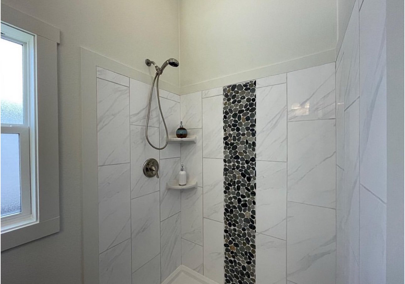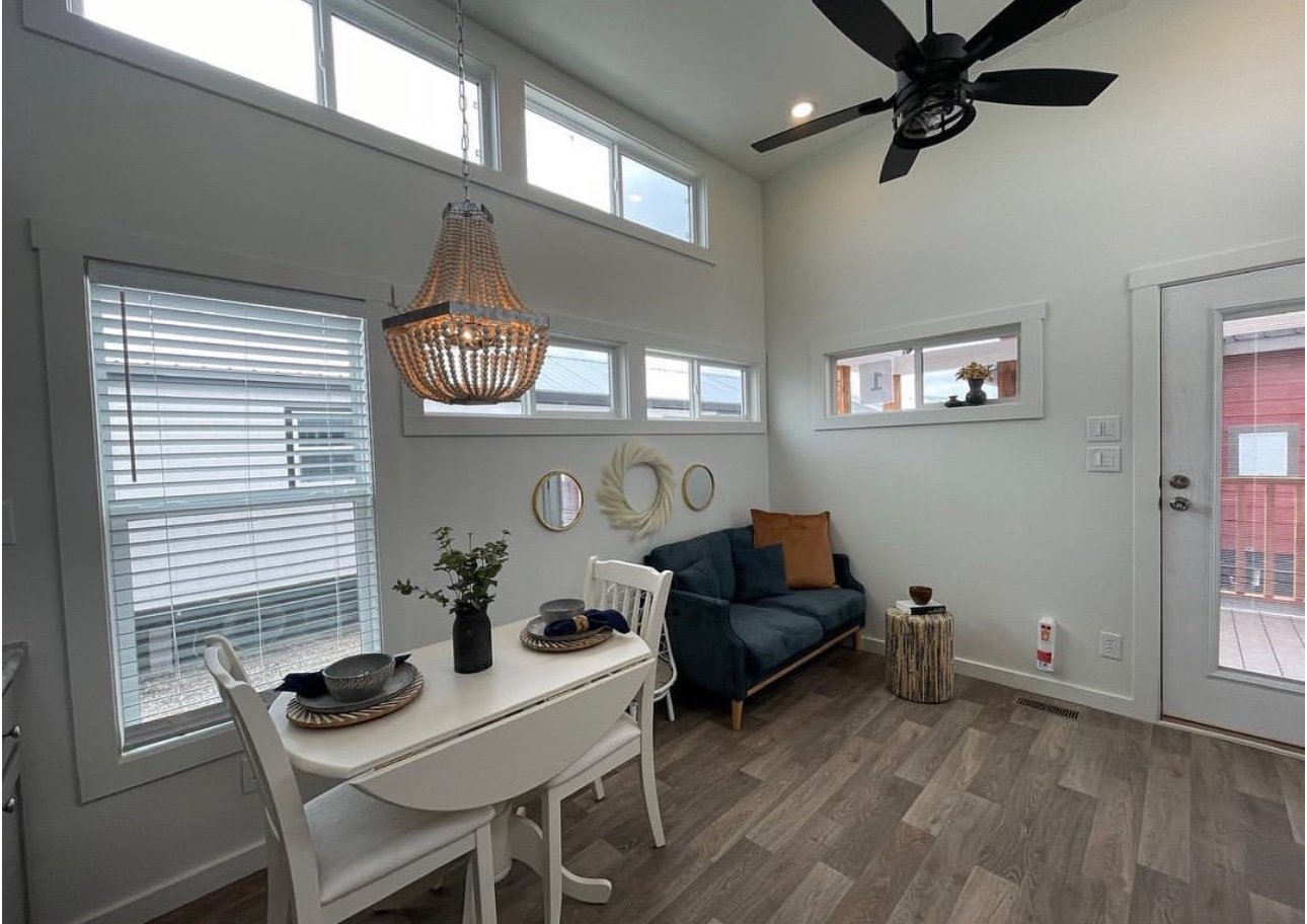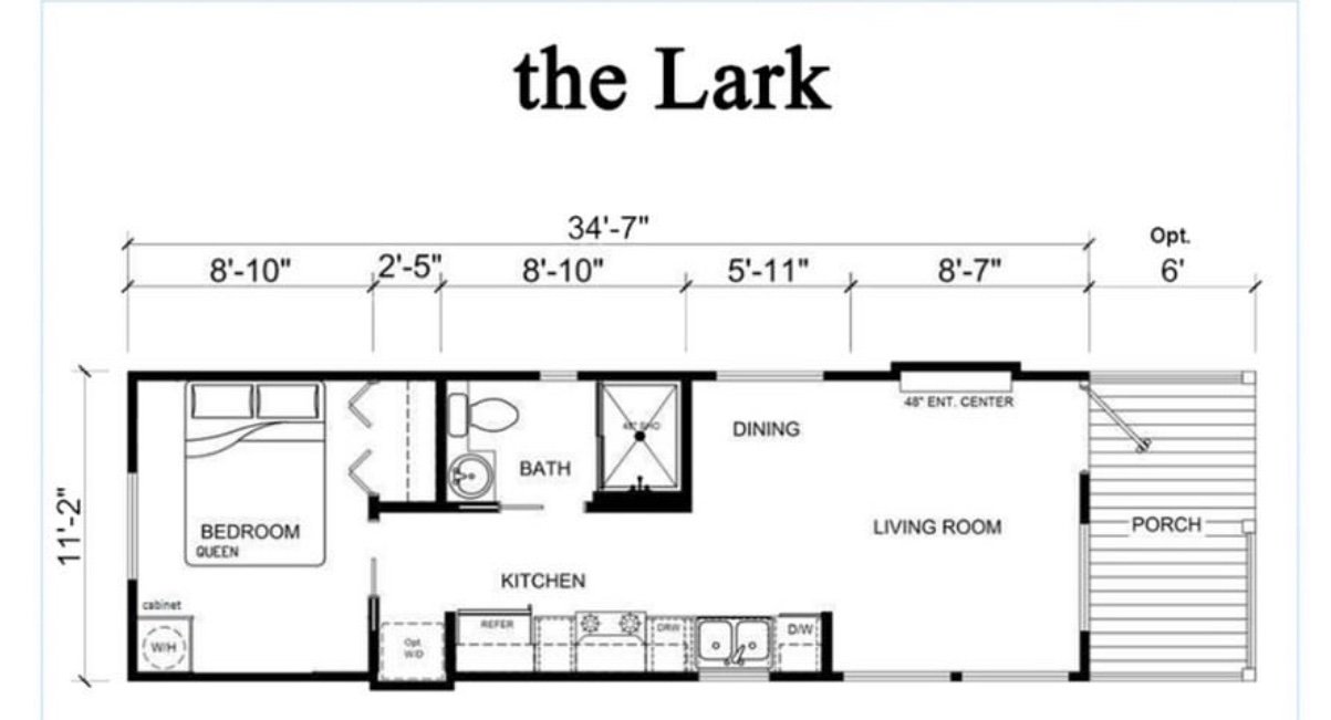 Loaded with options, this model is a one of a kind. The gorgeous cedar posts, trim, and porch railing grab your attention, and you can’t stop staring. It’s breathtaking with the copper roof. The front porch is perfectly designed to accommodate large outdoor furniture. And travel along side the side porch to a screened-in rear porch. Imagine enjoying your morning coffee on the back porch of this beauty! Inside we have custom lighting that compliments the white washed soffits over the cabinets, the new grey pebblestone tile accent in the low-lip shower, and a white washed accent wall in the bedroom that is designed to perfectly frame your bed. And in the kitchen we have the new LIMITED RUN upgraded tile that blends so many great colors together. You will have endless decor options in this tiny house! What’s most exciting about this model is that it’s prepped for central air and heat.