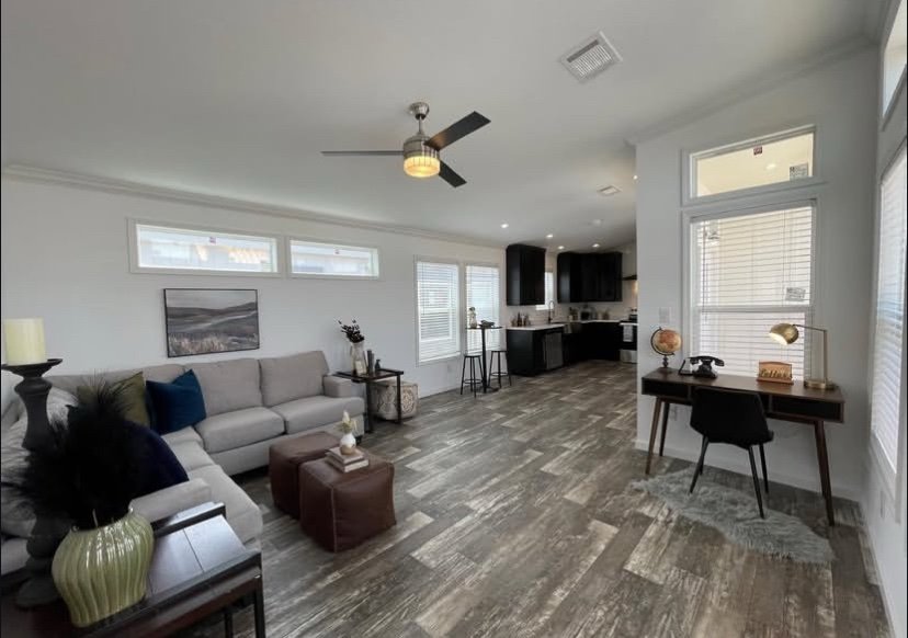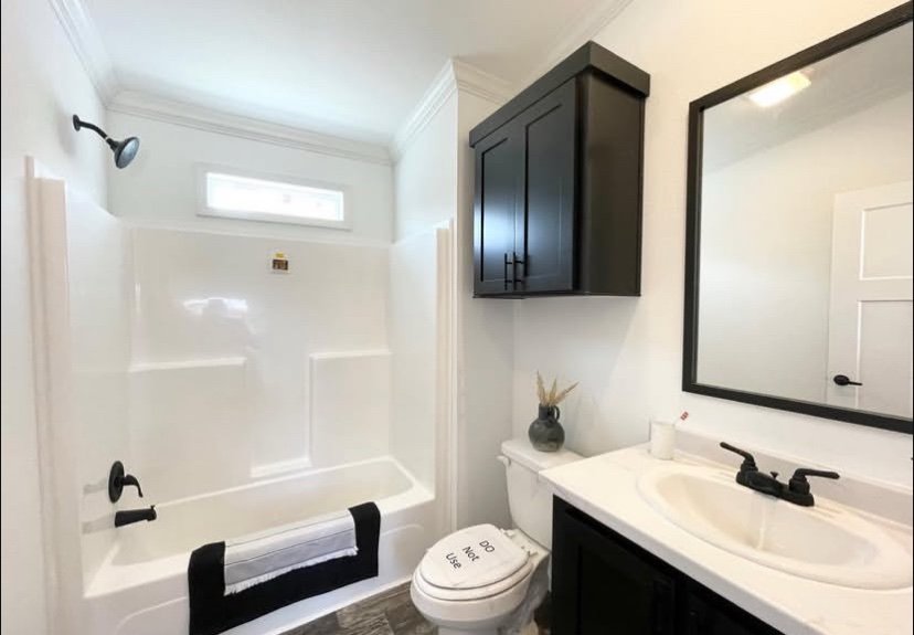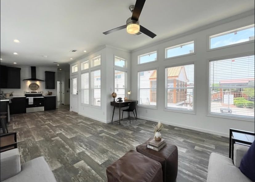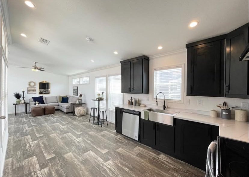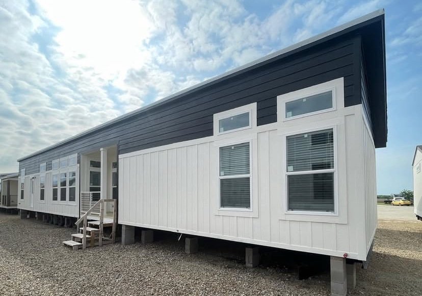 Single section with a monoslope roofline you will love this modern style house with its beautiful black cabinets.