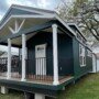 RV park model tiny house This beautiful green exterior pairs perfectly with the light and bright interior. We mixed grey and white cabinets in this one for a classy modern look, with beautiful decorative tile backsplash, moveable island, king sized bedroom and an amazing tile shower!