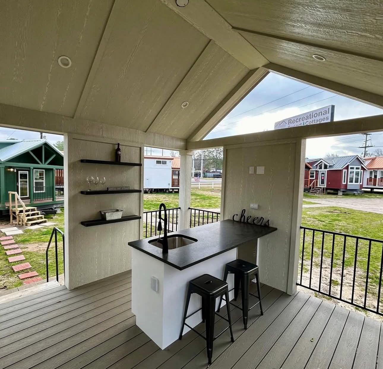 Featuring an amazing outdoor kitchen with built in sink, refrigerator and shelves!