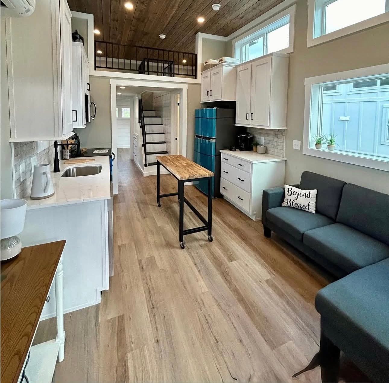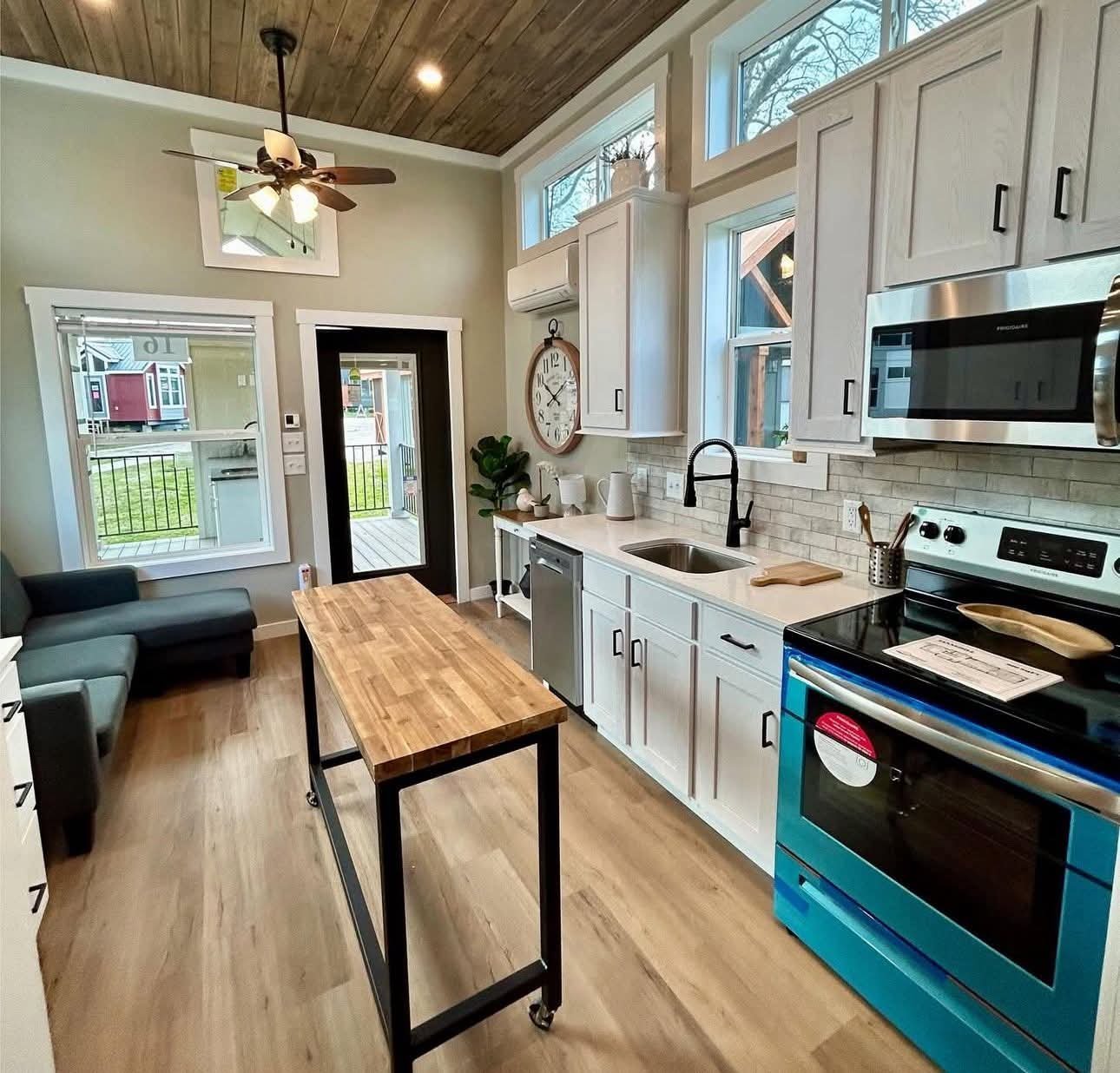 Inside this newly designed galley style kitchen features tall ceilings, tons of windows, a moveable butcher block island, and beautiful quartz