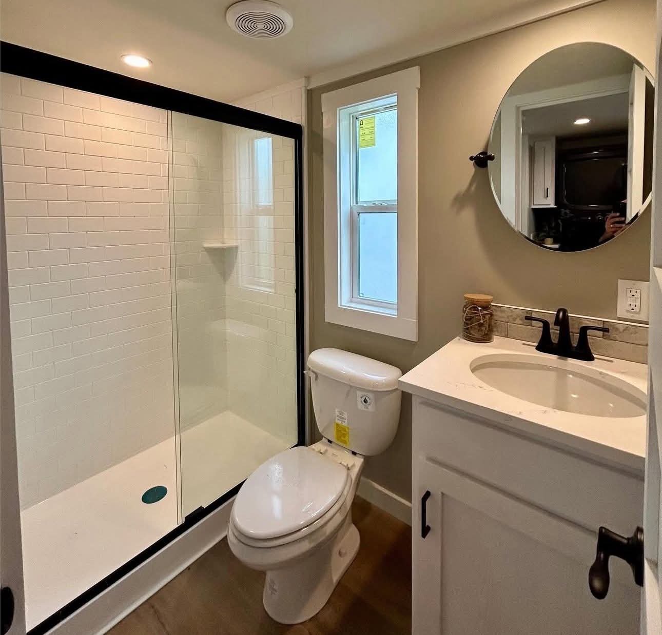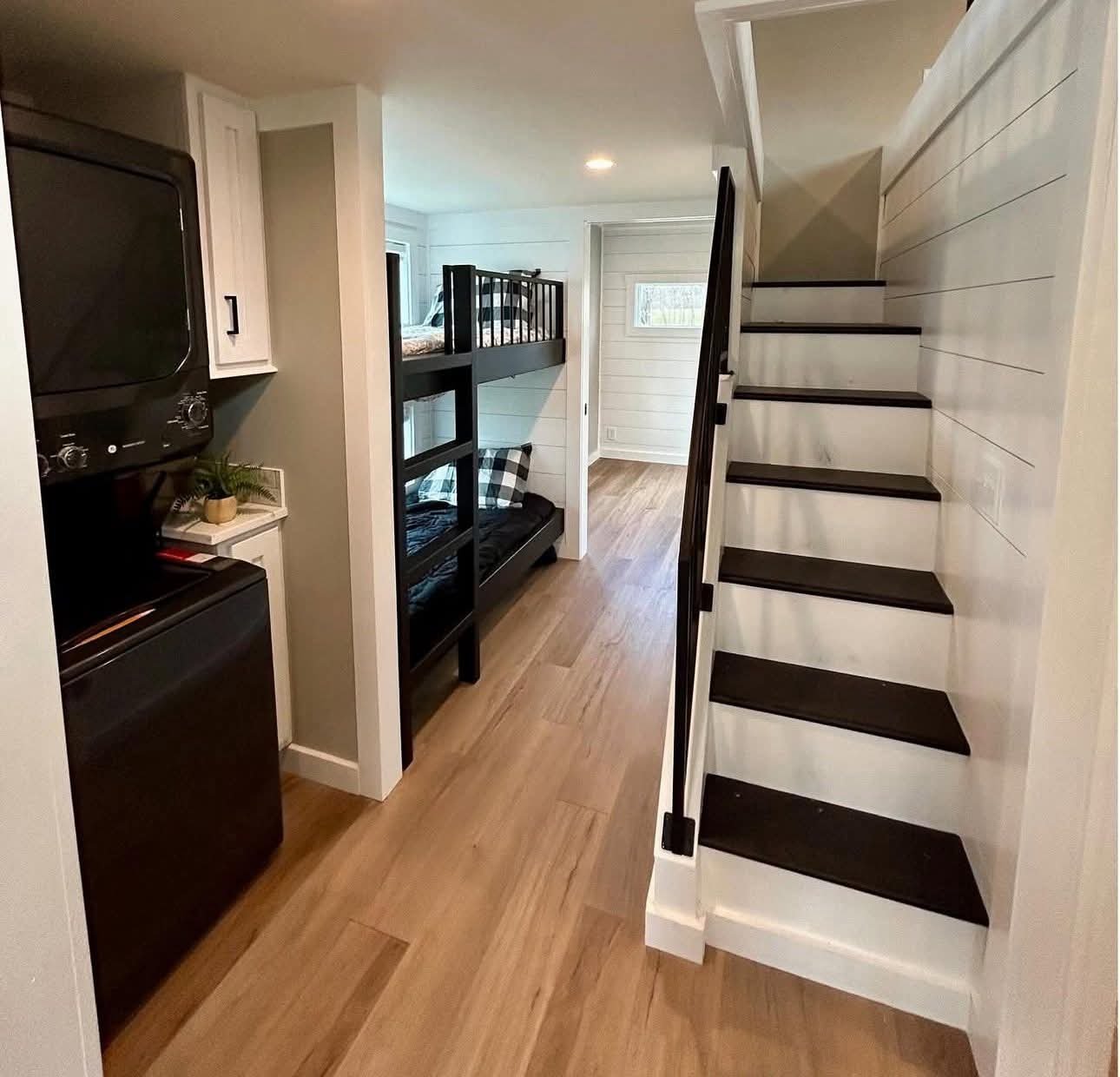 The hallway has built in bunk beds, a laundry area, and built in dresser under the staircase. The bathroom is spacious with a new subway tile look shower.