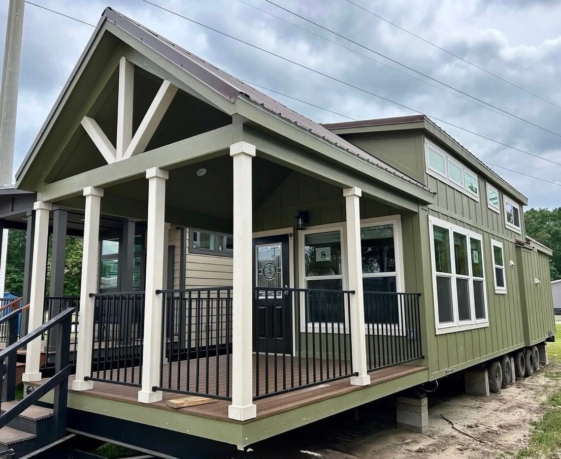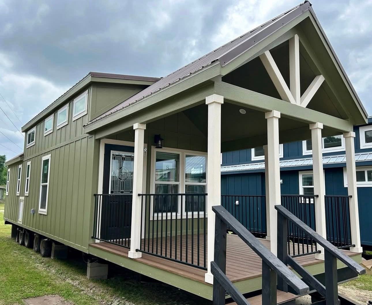 This one features a 12′ front porch, FULL pine interior, double clerestories, stainless appliance pkg, tile shower, WD included, upgraded painted Blue cabinets and so much more!