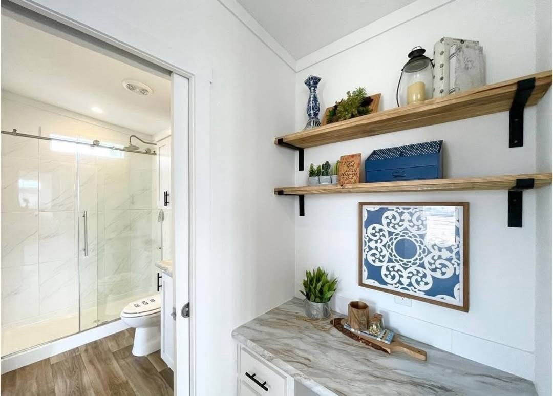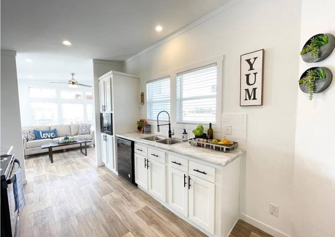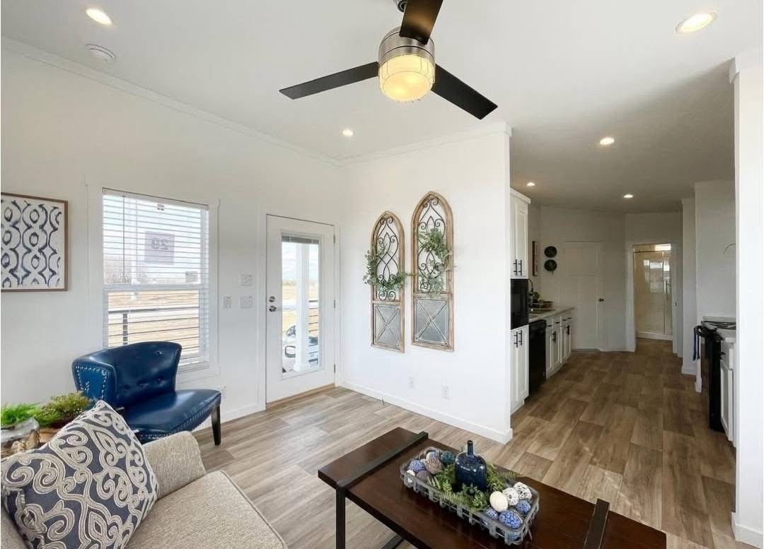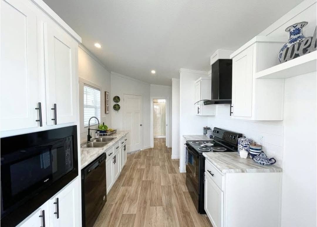 Interior Features: Wood-look vinyl flooring, white cabinetry, recessed lighting, black hardware, modern range hood