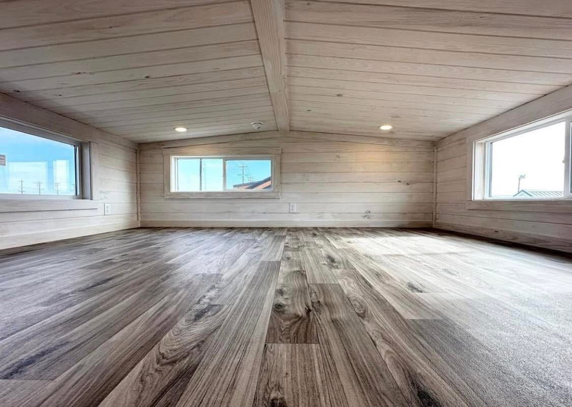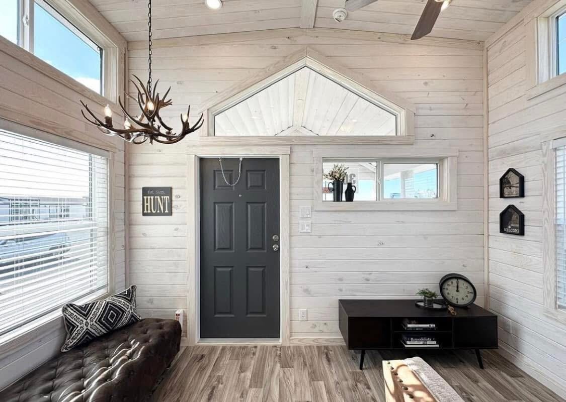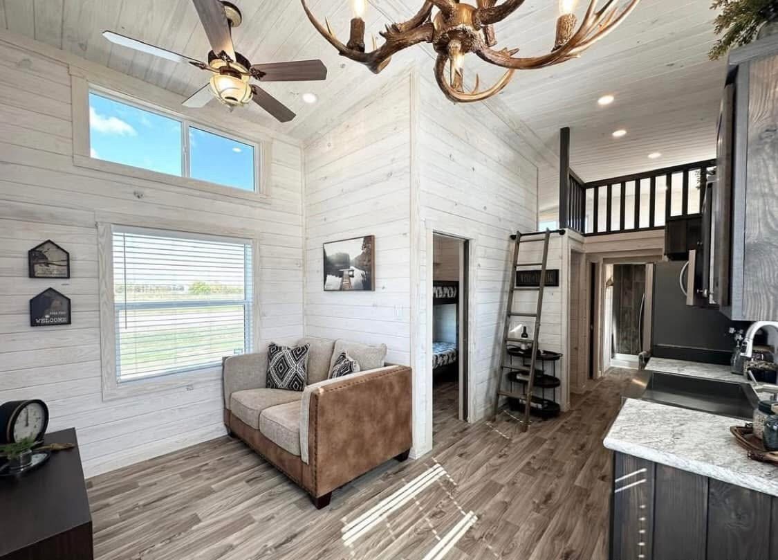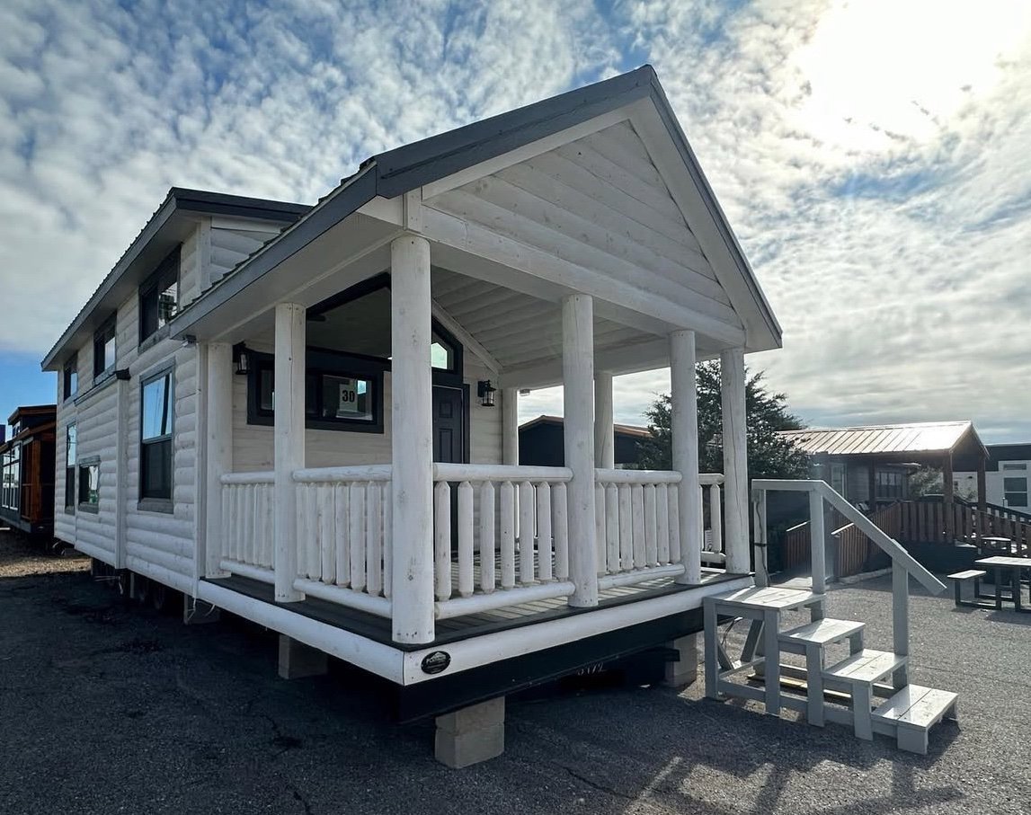 399 sq foot RV park model white king cabin with a loft