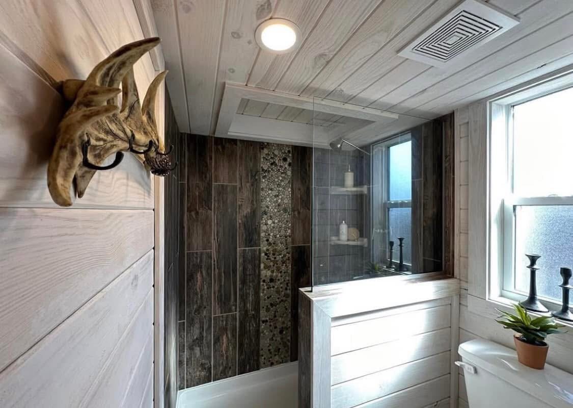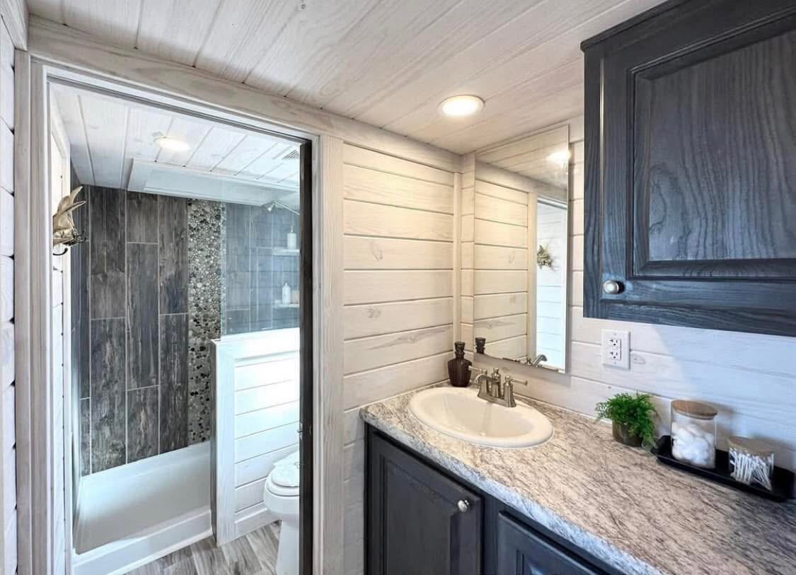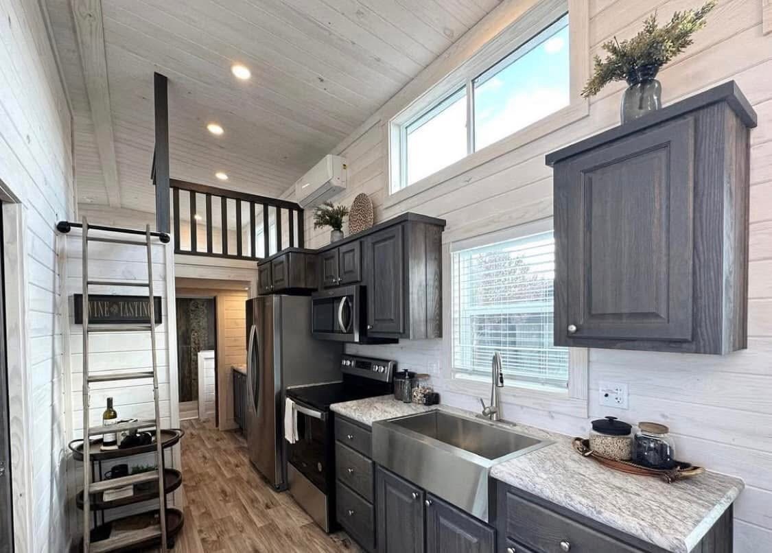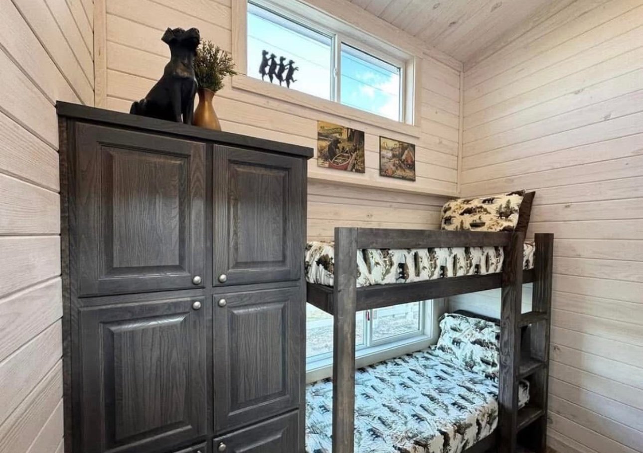 399 sq foot RV park model white king cabin with a loft