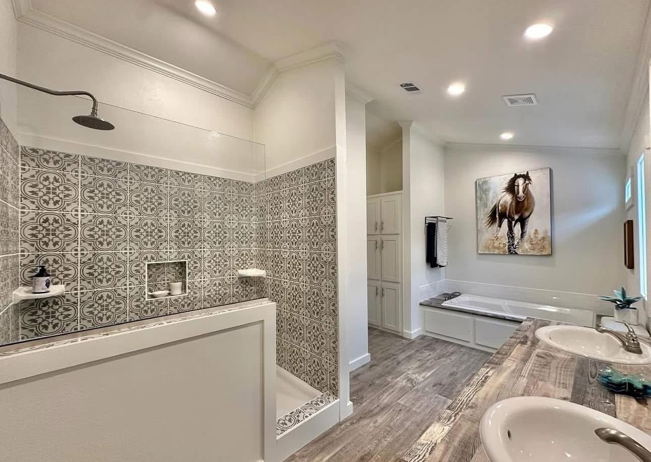 More in the kitchen – shiplap accents, beautiful white tile backsplash behind the stove, open shelving and (a new feature!) pop up outlets/USB ports on the island The large bathroom has a beautiful, large mosaic tile shower with a separate bathtub and shiplap accents behind the mirrors.