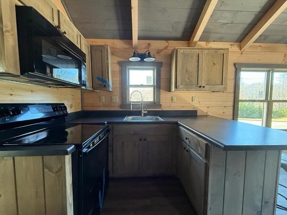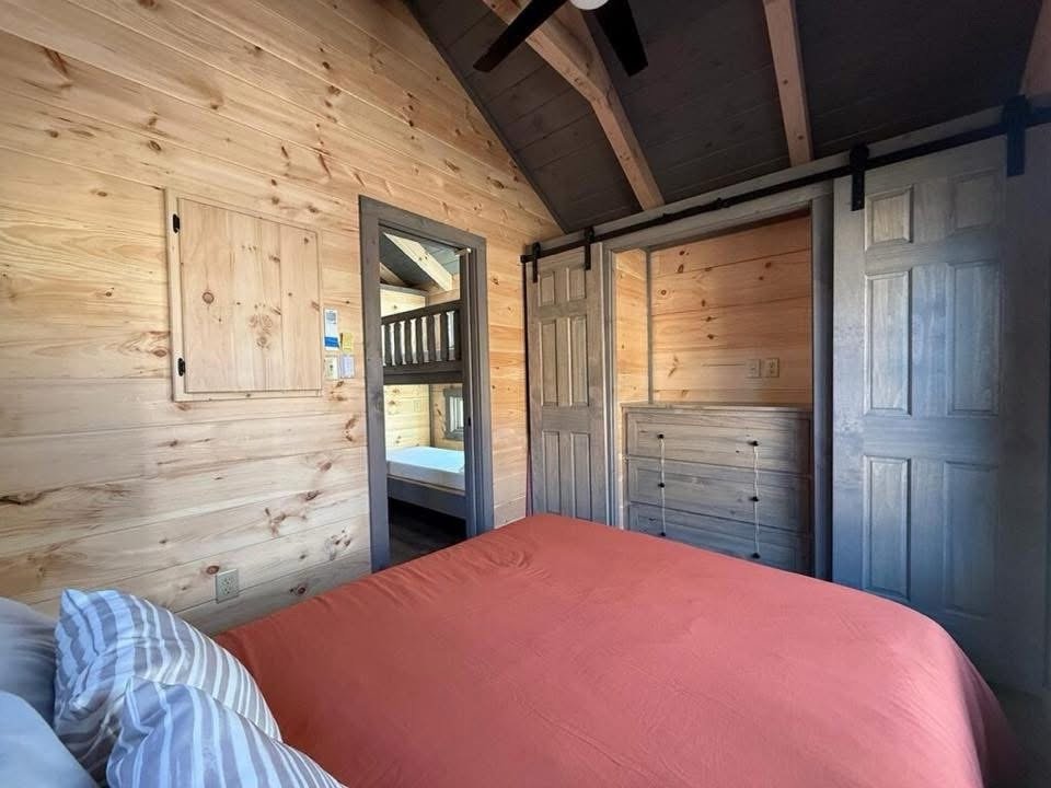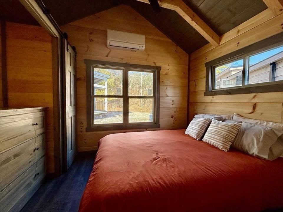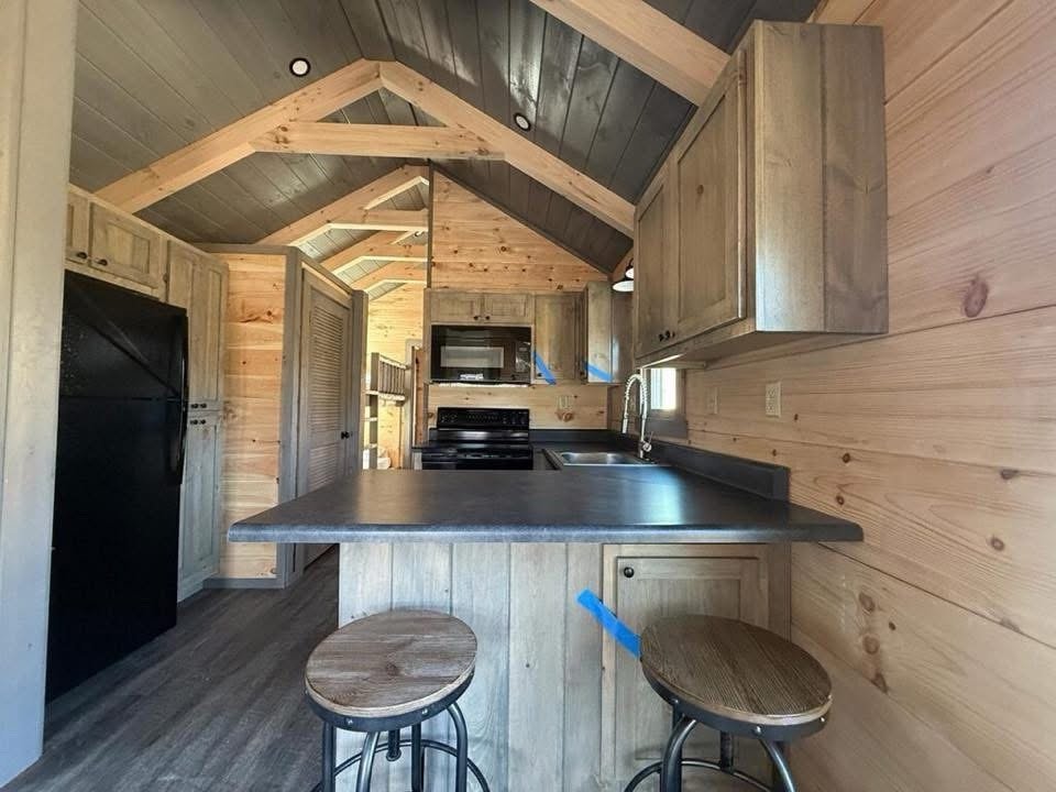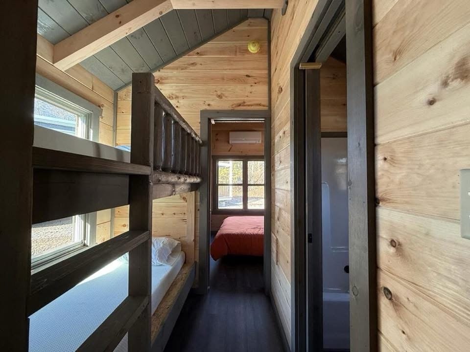 This Nomad tiny home model is a 397 square feet, 12′ x 40′, 1 bedroom, 1 bath with bunk beds RV park model that comfortably sleeps 6 people.