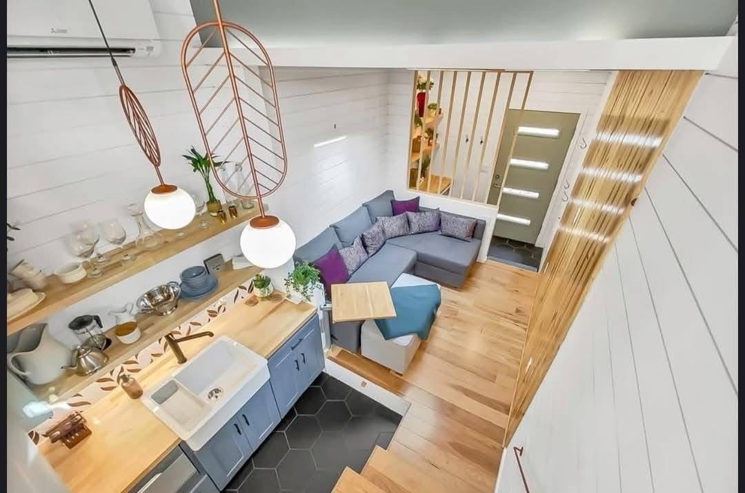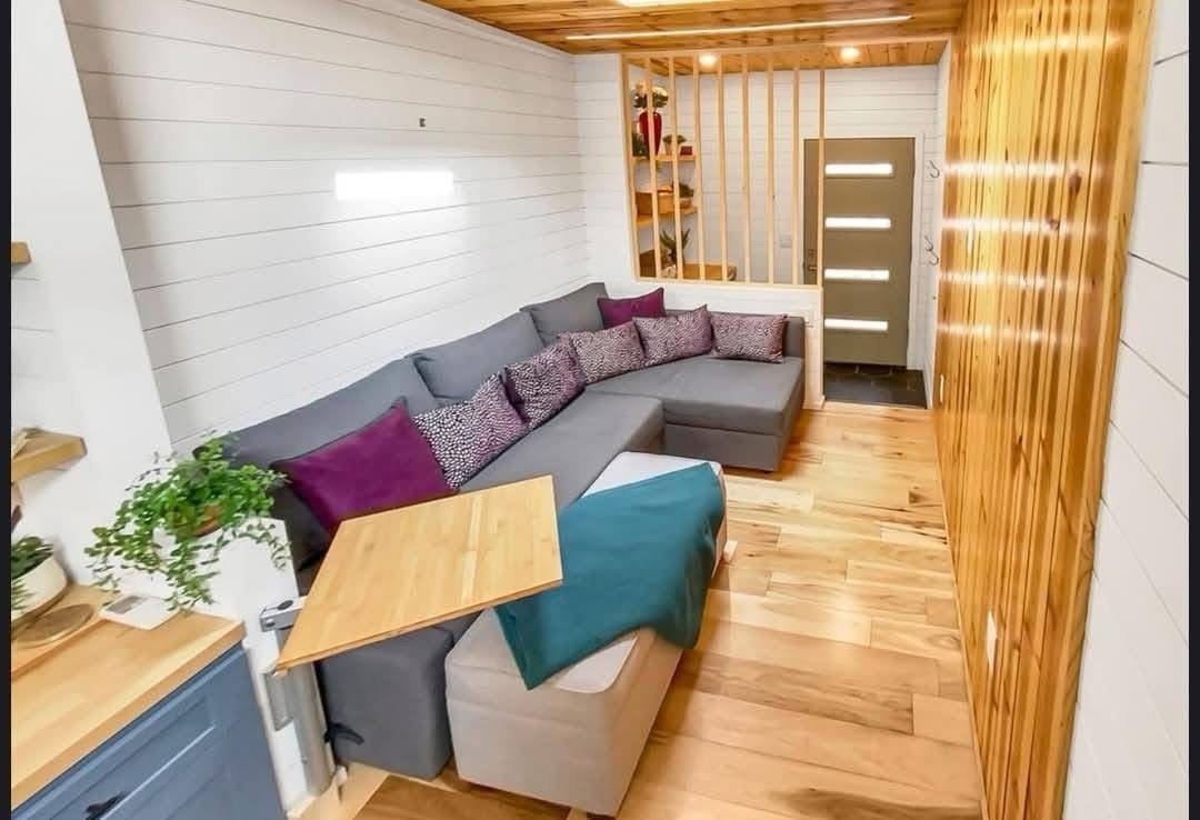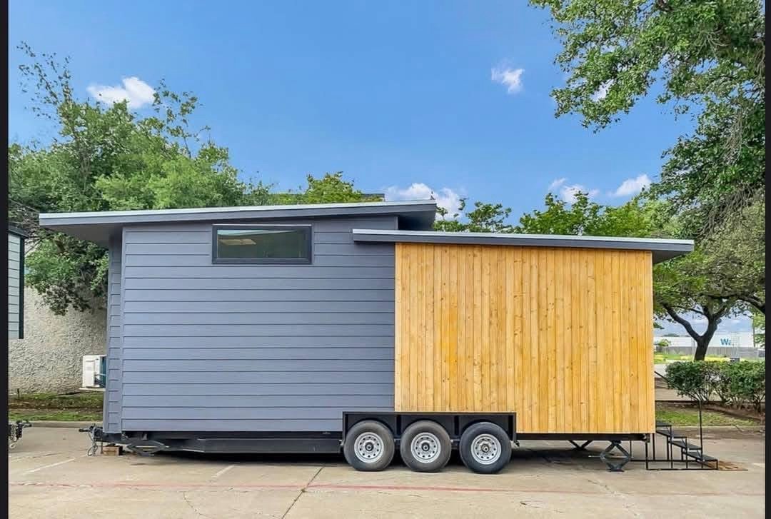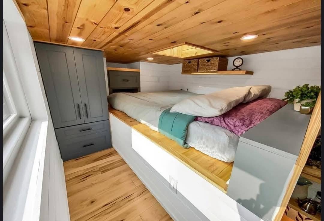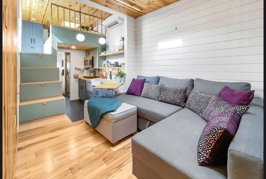 Designed by an architect & tiny home enthusiast, this beautiful tiny home on wheels maximizes every inch of space! Goldstein Tiny Home Details: Modern Exterior White Shiplap Walls & beautiful Fixtures throughout the Interior Entry is a separate Mud Room/Laundry Room with Tile Back-Splash Living Room features a Convertible Sleeper Sofa & wall-mounted TV Walnut Butcher Block Counter Tops Farmhouse Kitchen Sink Apartment Size Refrigerator Drawer Dishwasher Stow-away Cooktop Built-in Microwave & Vent Hood Storage Staircase Stand-up Loft Bedroom Full-Size, Built-In Wardrobe & matching Night Stand Queen Size Bed Platform Wall-mounted TV in the bedroom Bathroom features a beautiful Tile Floor Residential Flush Toilet 3’x4′ Shower with Tile Surround & Glass Doors Beautiful Walnut Trim & Walnut Open Shelving throughout the home Mitsubishi Mini-split AC & Heat Pump Wood framing High-quality Trailer built specifically for a Tiny Home on Wheels