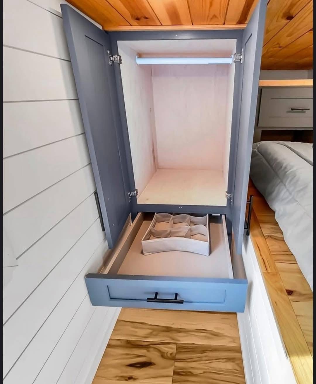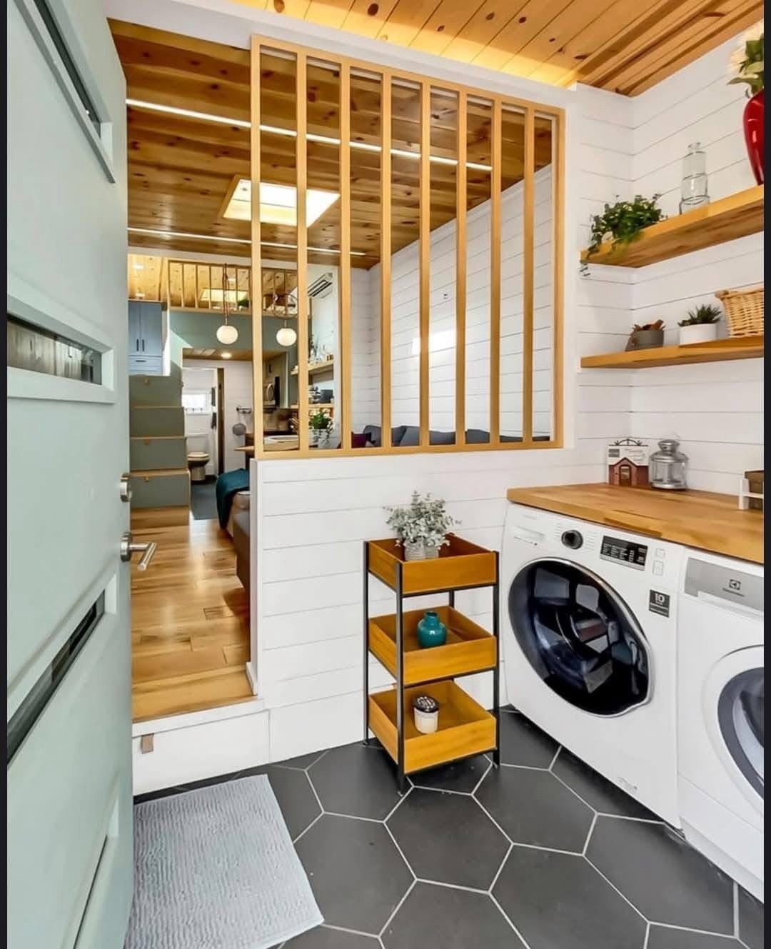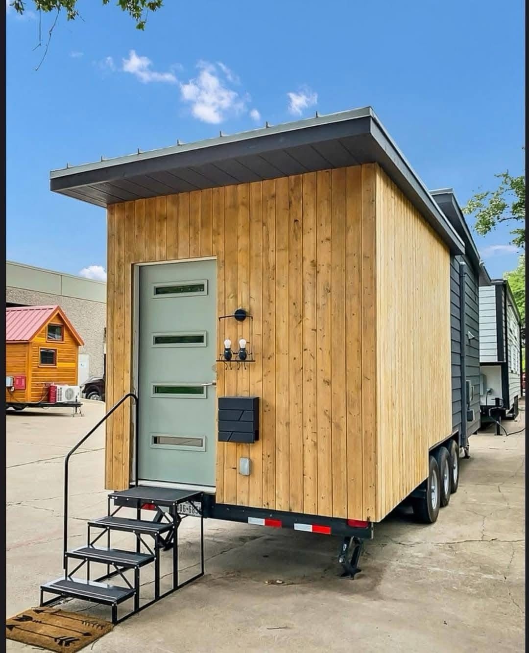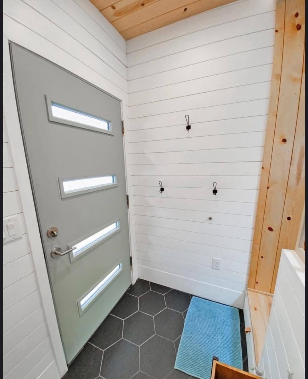 Designed by an architect & tiny home enthusiast, this beautiful tiny home on wheels maximizes every inch of space! Goldstein Tiny Home Details: Modern Exterior White Shiplap Walls & beautiful Fixtures throughout the Interior Entry is a separate Mud Room/Laundry Room with Tile Back-Splash Living Room features a Convertible Sleeper Sofa & wall-mounted TV Walnut Butcher Block Counter Tops Farmhouse Kitchen Sink Apartment Size Refrigerator Drawer Dishwasher Stow-away Cooktop Built-in Microwave & Vent Hood Storage Staircase Stand-up Loft Bedroom Full-Size, Built-In Wardrobe & matching Night Stand Queen Size Bed Platform Wall-mounted TV in the bedroom Bathroom features a beautiful Tile Floor Residential Flush Toilet 3’x4′ Shower with Tile Surround & Glass Doors Beautiful Walnut Trim & Walnut Open Shelving throughout the home Mitsubishi Mini-split AC & Heat Pump Wood framing High-quality Trailer built specifically for a Tiny Home on Wheels