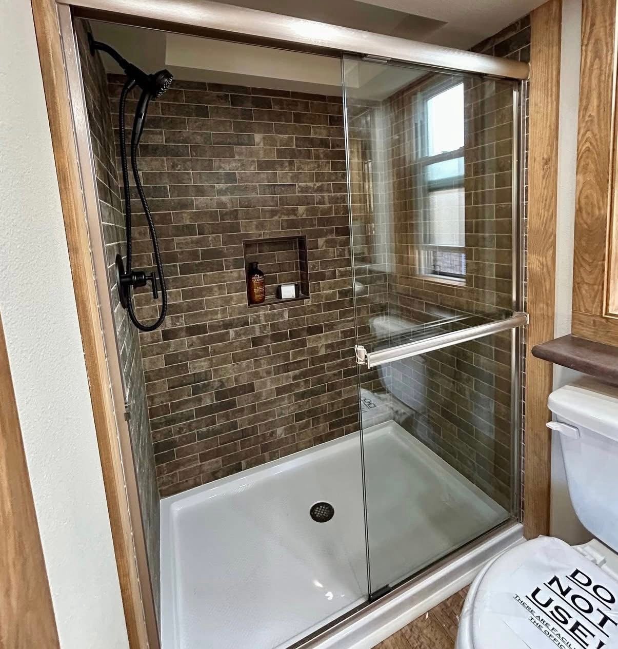 Spacious bathroom with a tiled walk-in shower, glass doors & dual storage options