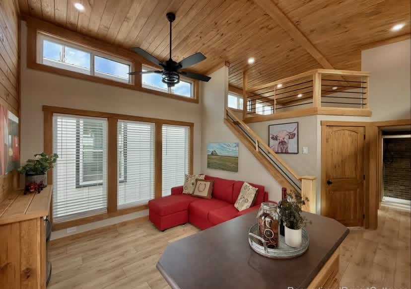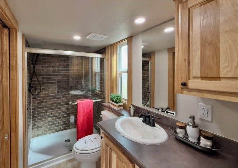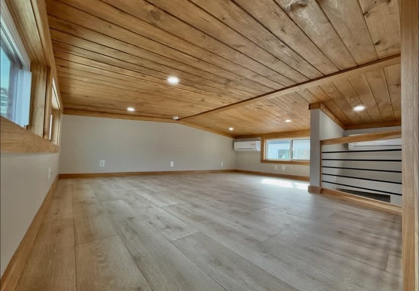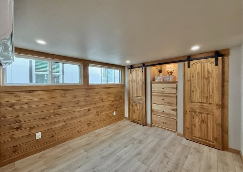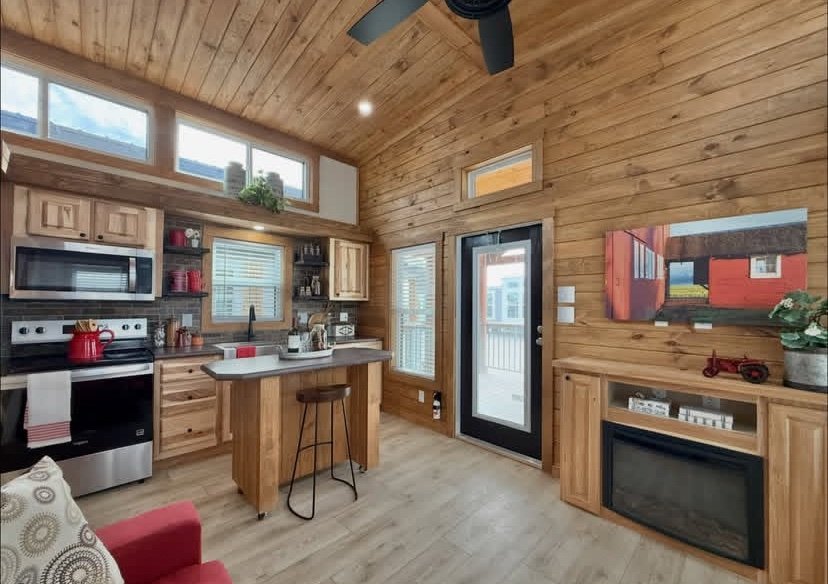 This model is done in a cabin style with hickory cabinets, stained southern yellow pine accent walls and ceiling.